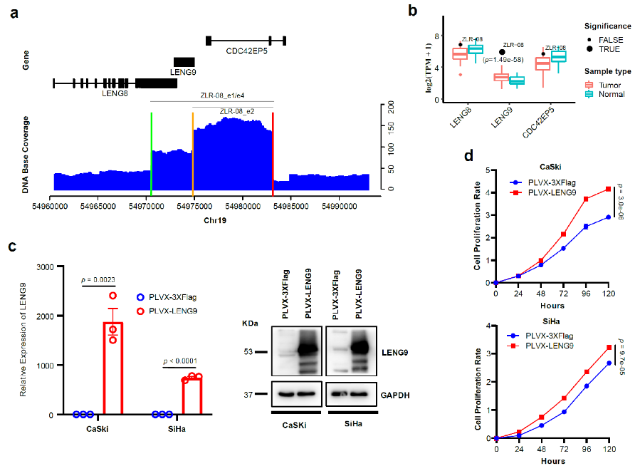 此外,结合相应的RNA-seq数据,研究团队发现了三个新的宫颈癌致癌候选基因(LINC00290, LINC02500和LENG9)及其可能的致癌机制。其中,LENG9基因片段因为和HPV形成eccDNA结构而大量扩增,相应的表达水平也大幅上调;细胞学实验亦证实了该基因高表达能显著促进细胞增殖、迁移和侵袭(图4)。