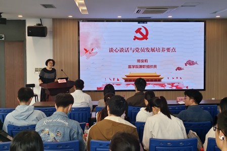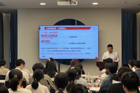 下午一时三十分,2023-2024学年秋冬学期党务工作培训在医学院科研楼辅楼报告厅召开,医学院兼职辅导员石嘉和到场分享。石嘉和对发展党员的工作流程进行简要介绍,并以入党流程为依托,就档案文件的规范性和检查事项、积极分子和发展对象培养考察工作细节、预备党员发展过程工作流程等内容进行详尽介绍,使现场党务工作骨干对于组织工作的流程和规范更加明晰。